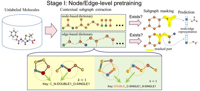 GROVER 同样分为两个阶段。在节点阶段,我们还同时考虑了边,但为了说明简单,这里仅讨论节点表征过程。在这一阶段,首先为每个节点提取一个词典池。我们称之为 key。然后我们像 BERT 一样为每个节点加掩码,然后预测每个节点周围的局部结构。如果局部结构与词典中的一个 key 匹配,则在该维度上输出 1,否则便输出 0。注意这是一个多标签分类问题,因为每个节点的局部结构通常有多个。这样,我们仅需要一类掩码就能做到 PreGNN 的两件事。
