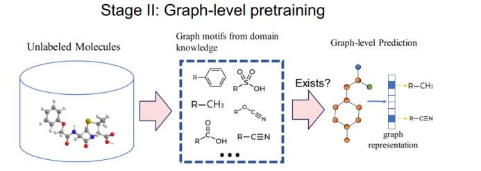 在这一阶段,PreGNN 提出了两种损失函数。周围结构预测(context prediction)是强制节点表征与其周围结构相似。另外我们还执行负采样来最小化 h_v 与其它节点的周围结构之间的相似性。这个方法的思路很简单:每个节点周围的结构定义了该节点的局部拓扑结构。