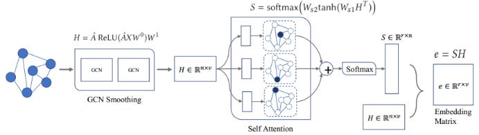 首先来看第一个问题。图表征与节点表征在不同的层面上;在节点层面上图 G 会被投射到大小为 n×v 的隐藏空间中;而在图层面上图 G 会被投射成大小为 v 的隐藏向量。因此,为了将节点层面的空间转换成图层面的向量,这里引入了自注意力图嵌入(SGAE)。