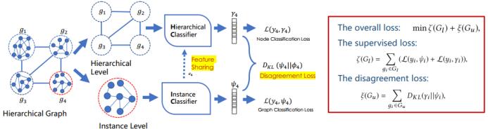 对于第二个问题:如何整合实例层面和分层层面的信息?这里实例层面是基于 SAGE 的图层面学习,分层层面模型是节点层面的学习。我们使用了特征共享来连接 SAGE 的输出和 GCN 的输入。然后又引入一种新的分歧损失(disagreement loss)来最小化实例分类器和分层分类器之间的不一致情况。