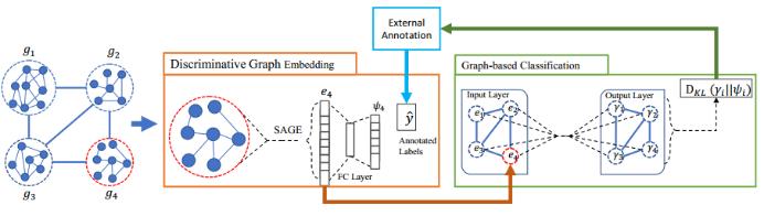 如果仅考虑组之间的联系,那么这个问题就又回到了节点分类。但是,可以看到每一组都有自己的用户图,忽略这样的信息并不合适。为了在用户和分组层面上利用图信息,我们面临着这样的难题:如何将任意大小的图表征为固定长度的向量?如何整合实例层面和分层层面的信息?