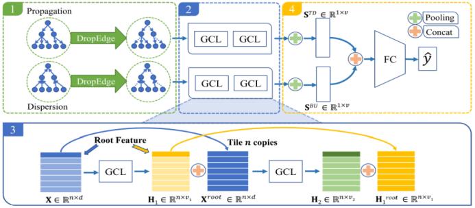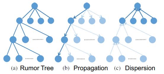 谣言可算是当今社会面临的一大顽疾。这篇论文提出通过关注和转发关系来检测社交媒体上的谣言。不管是谣言还是新闻,它们的传播模式都是树结构的。但通常来说,谣言的传播有两个属性。第一如下图 b 所示,其会沿一条关系链进行很深的传播。第二如图 c,谣言在社交媒体上传播时散布很宽。举个例子,一个 Twitter 用户可能有大量关注者。