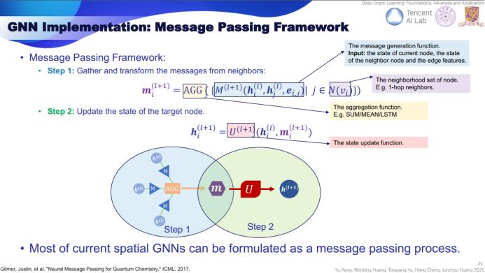 第一步是消息生成步骤。首先,从近邻节点收集状态数据,然后使用对应函数生成当前节点的消息。在第二步中,我们更新目标节点的状态。