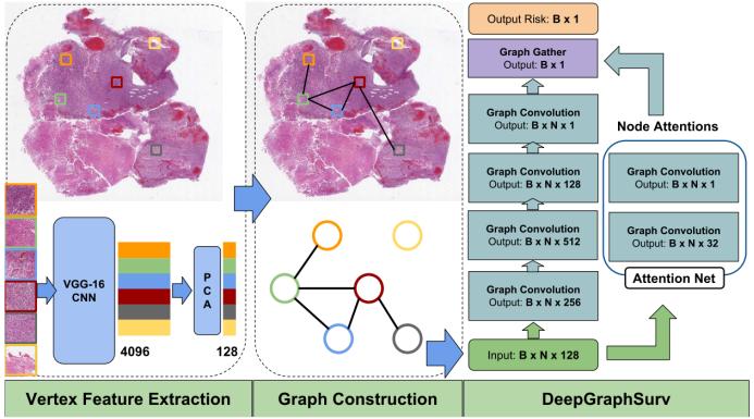 为此,我们提出将 WSI 建模成图,然后开发了一种图卷积神经网络(Graph CNN),其使用了注意力机制,可通过提供 WSI 的最优图表征来实现更好的生存分析。