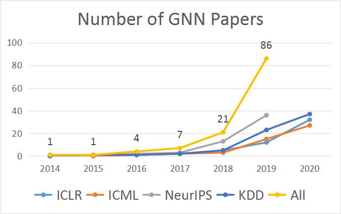 在第一个阶段,GNN 所使用的主要方法是基于循环神经网络(RNN)的扩展。众所周知,RNN 擅长处理序列数据,而反过来,序列数据则可被视为一种特殊模式的图。因此,早期的一些工作(TNN97 / TNN08)将处理序列数据的 RNN 泛化用于树和有向无环图(DAG)等特殊的图结构。但那之后这一领域的发展几乎陷入了停滞状态。然而,在当前这轮深度学习热潮的带动下,对非结构化数据的建模和处理的研究开始广泛涌现,GNN 也迎来了自己的发展契机,顶级会议上的相关论文数量也迅猛增长。