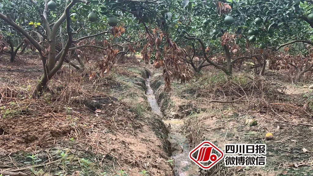 受污水渗漏影响的何场社区7组有270多位村民,耕地1000多亩,大部分种植不知火、爱媛等果树。而此次受污染的土地,据村民们反映有上百亩、涉及近20户。9月,往年正是果实累累的季节。但当记者来到一户村民的果园时,只见地上青草连片枯萎,10多株不知火果树的树叶枯黄,果实坏死,水沟里还能看到片片油污。