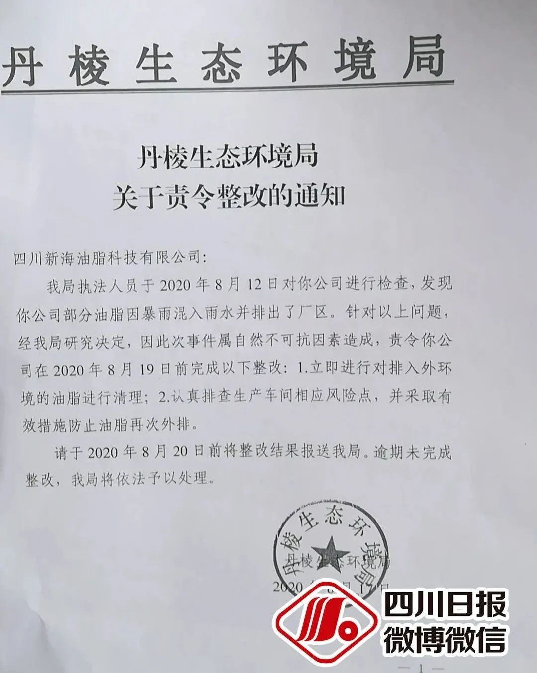 污染事件发生5天后,丹棱生态环境局下发了整改通知,通知写到“此次事件属自然不可抗因素造成”,该局提供的一份现场检查笔录显示,由于当晚下暴雨,厂里的污水处理池漫出,大约持续2小时左右。