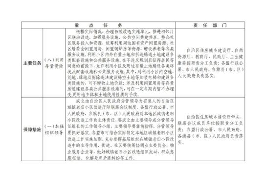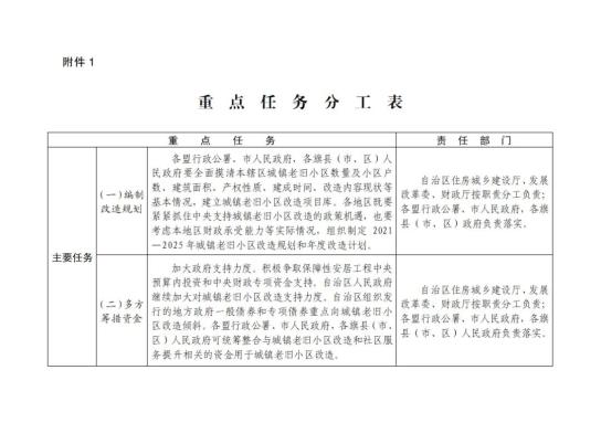 1.加大政府支持力度。积极争取保障性安居工程中央预算内投资和中央财政专项资金支持。自治区人民政府继续加大对城镇老旧小区改造支持力度。自治区组织发行的地方政府一般债券和专项债券重点向城镇老旧小区改造倾斜。各盟行政公署、市人民政府,各旗县(市、区)人民政府可统筹整合与城镇老旧小区改造和社区服务提升相关的资金用于城镇老旧小区改造。