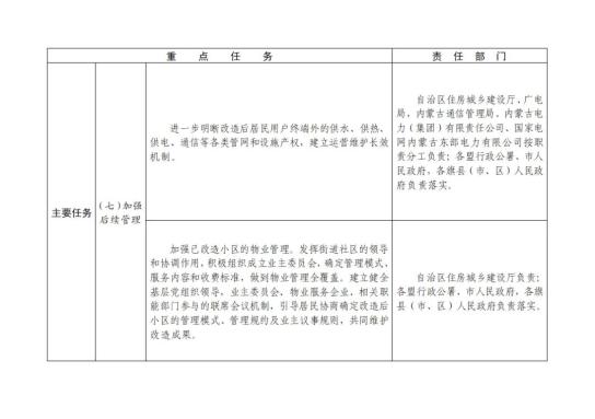 (七)加强后续管理。进一步明晰改造后居民用户终端外的供水、供热、供电、通信等各类管网和设施产权,建立运营维护长效机制。加强已改造小区的物业管理。充分发挥街道、社区的领导和协调作用,积极组织成立业主委员会,确定管理模式、服务内容和收费标准,做到物业管理全覆盖。建立健全基层党组织领导,业主委员会、物业服务企业、相关职能部门参与的联席会议机制,引导居民协商确定改造后小区的管理模式、管理规约及业主议事规则,共同维护改造成果。