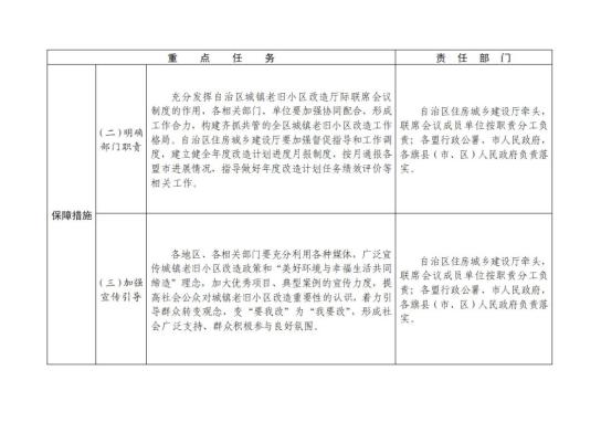 (一)加强组织领导。成立由自治区人民政府分管领导为召集人的自治区城镇老旧小区改造厅际联席会议制度。各盟行政公署、市人民政府,各旗县(市、区)人民政府对本地区城镇老旧小区改造工作负主体责任,要成立由主要领导或分管领导任组长的工作领导小组,主要领导要靠前指挥,分管领导要抓好落实。各盟市可结合实际制定本地区城镇老旧小区改造工作实施细则。要充分发挥基层组织在城镇老旧小区改造中的主导作用,街道、社区要统筹协调业主委员会、物业服务企业等,做好城镇老旧小区改造组织发动、群众意愿征集、化解处理矛盾纠纷等工作。