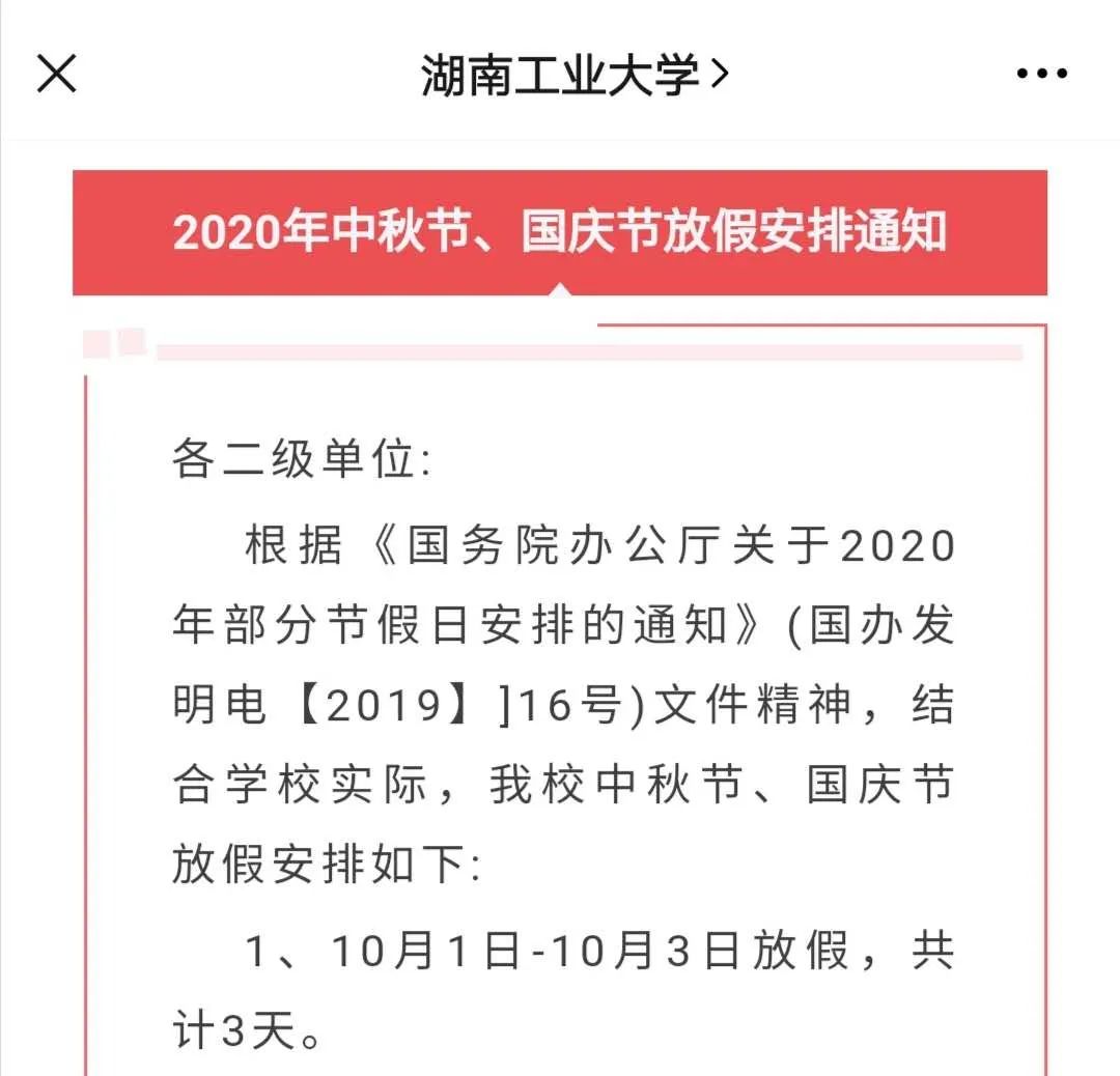 湖南工业大学“关于2020年中秋、国庆放假安排的通知”显示,学校10月1日-3日放假,共三天;10月4日-8日正常上课。对于新生来说,今天和明天才开始报到,这个长假里,学校计划对新生开展军训等工作。