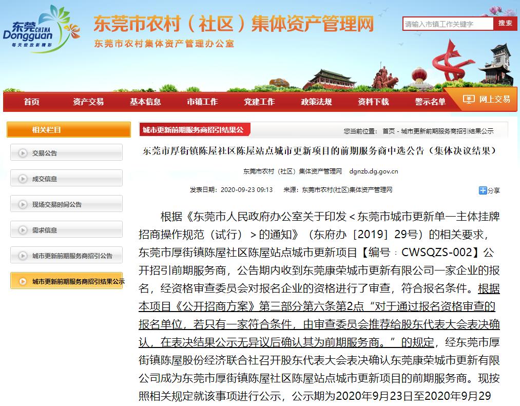公告称,根据《东莞市人民政府办公室关于印发<东莞市城市更新单一主体挂牌招商操作规范(试行)>的通知》(东府办[2019]29号)的相关要求,东莞市厚街镇陈屋社区陈屋站点城市更新项目【编号﹕CWSQZS-002】公开招引前期服务商,公告期内收到东莞康荣城市更新有限公司一家企业的报名,经资格审查委员会对报名企业的资格进行了审查,符合报名条件。根据相关规定,经东莞市厚街镇陈屋股份经济联合社召开股东代表大会表决确认东莞康荣城市更新有限公司成为东莞市厚街镇陈屋社区陈屋站点城市更新项目的前期服务商。现按照相关规定就该事项进行公示,公示期为2020年9月23日至2020年9月29日。
