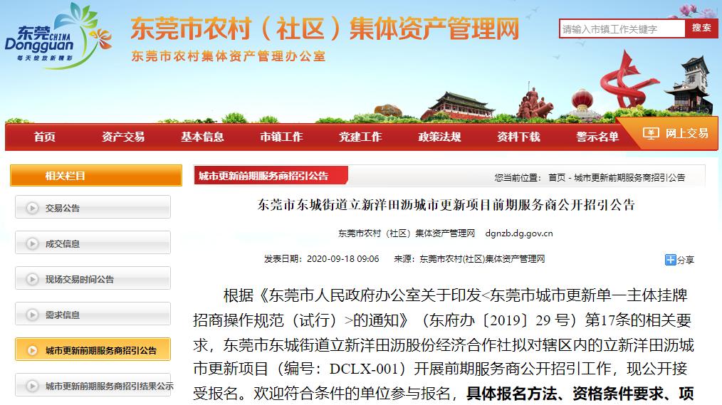 近日,东莞市农村(社区)集体资产管理网发布了“东莞市东城街道立新洋田沥城市更新项目前期服务商公开招引公告”。