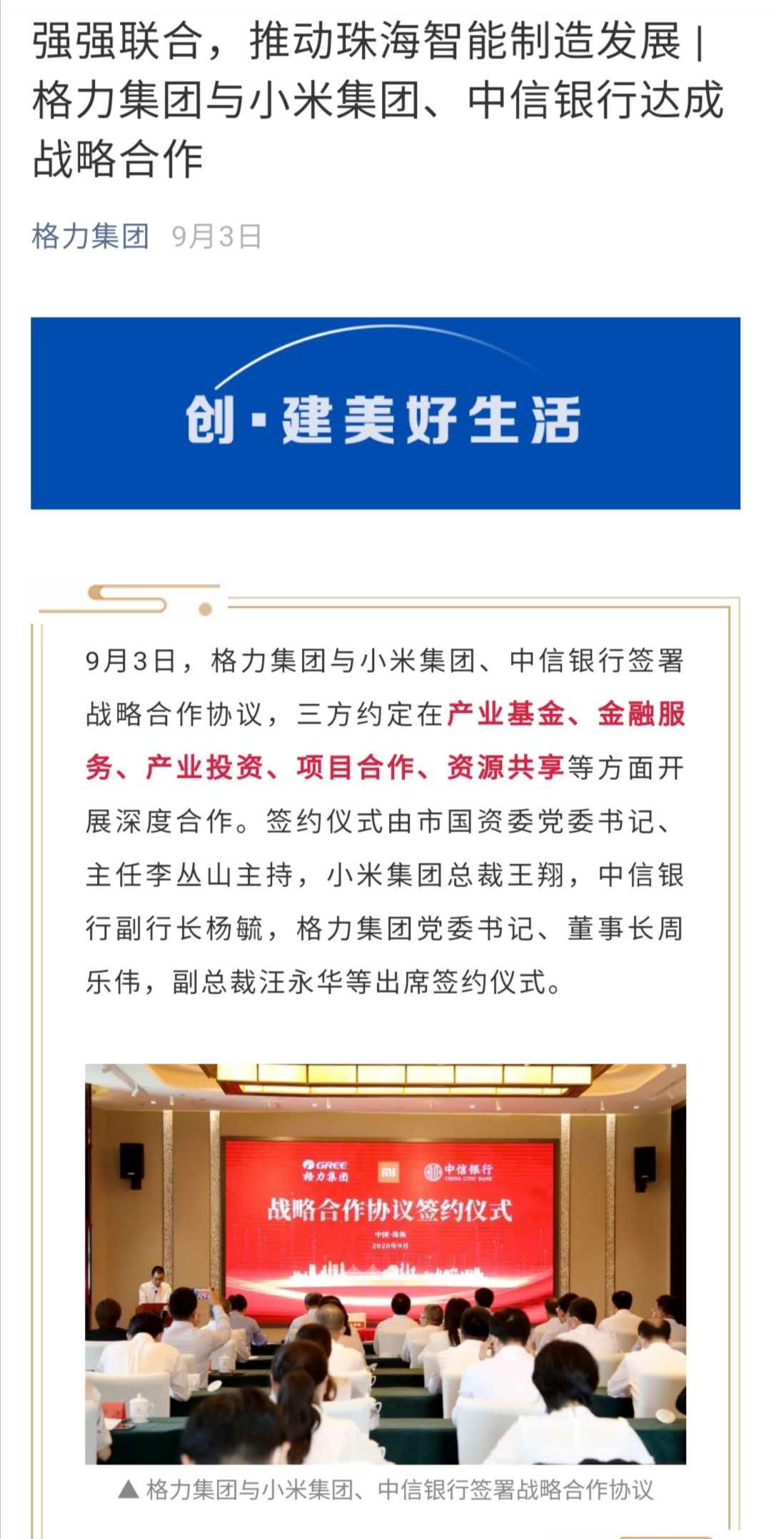 据格力集团微信公众号发布的消息,9月3日,格力集团与小米集团、中信银行签署战略合作协议,三方约定在产业基金、金融服务、产业投资、项目合作、资源共享等方面开展深度合作。