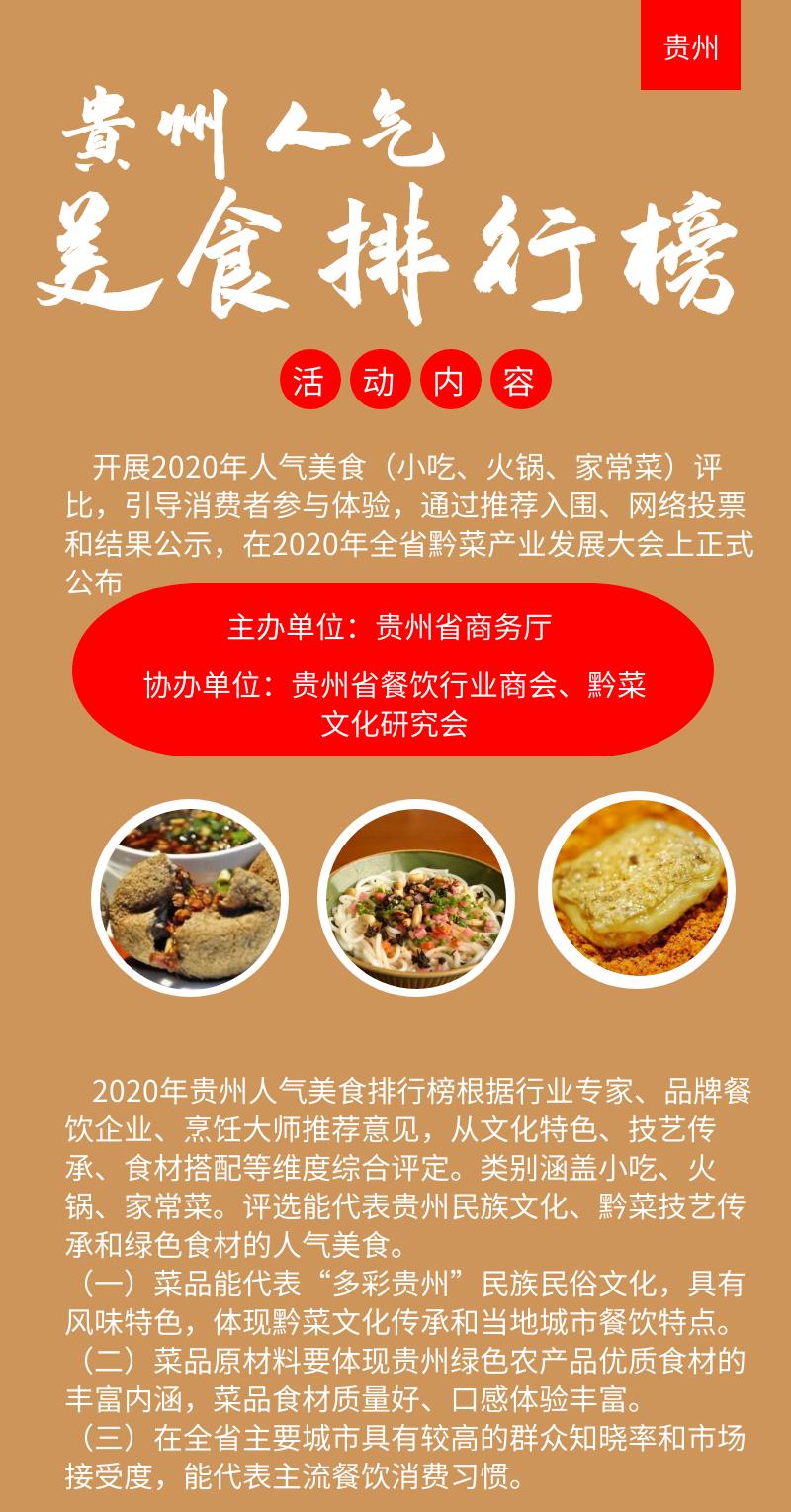 9月23日,贵州省商务厅发布消息,为引导消费者积极消费,让更多美食走进千家万户,由省商务厅主办、贵州省餐饮行业商会黔菜文化研究会协办的2020年贵州人气美食评选拉开帷幕。