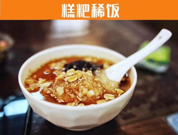 相传清光绪年间,贵州有一个姓卢的小贩,用糯米粉加碗耳糕,磨成浆汗甑蒸熟,点缀上玫瑰、芝麻、桃仁米,口味非常得嫩滑、香甜,人们称为"卢糕粑"。后又有城隍庙侧(大同街西口)的宋姓小贩,将"卢糕粑"改成园形,不加任何佐料,做成"宋糕粑"。园形糕粑配上荸荠粉调好的“稀饭”,便成贵州人爱吃的“糕粑稀饭”。采用蒸和冲的烹调方法制作;甜香味型;米香味浓,甜而不腻。