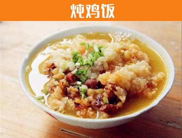 炖鸡饭是贵阳的特色美食之一,鸡肉炖离骨后再加盐,葱花在食用时洒在香菇炖鸡饭表面上,大米饭、面条、米粉煮烫好,香菇炖鸡炖好后随吃随加,味不够重,一般只加盐不加酱油 ,以保持汤的清爽。