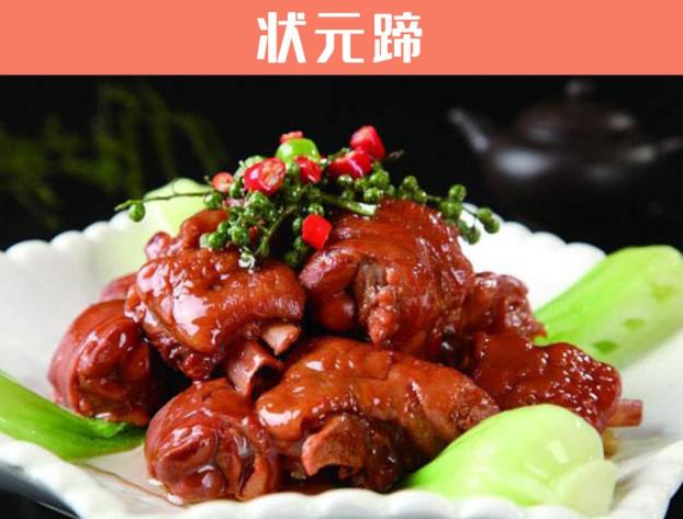 相传清朝青岩举人赵以炯,为上京赴考,常温功课至深夜;忽觉肚中饥饿,便信步走到夜市食摊,点卤猪脚宵夜,食后赞不绝口。摊主道:“贺喜少爷。”赵问:“何来之喜?”摊主不失时机道:“少爷,您吃了这猪脚,蹄题同音,好兆头,好兆头啊,定能金榜题名。”赵听后大笑,然上京赴考果真金榜题名,高中状元,回家祭祖时,重礼相谢摊主。采用红卤烹调方法制作;五香味型;色红褐,皮充盈泽润,质酥软,味醇厚,肥而不腻,酸辣中显鲜,肉香、调料香十足,食肉啃骨,回味无穷。