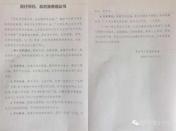 《厉行节约、反对浪费倡议书》从树立节约意识、节约用水、节约用电、节约用纸、节约粮食以及示范带动六个方面发出倡议,时刻提醒着文华师生要铭记“成由勤俭败由奢”的历史经验,大力弘扬勤俭节约的中华传统美德。