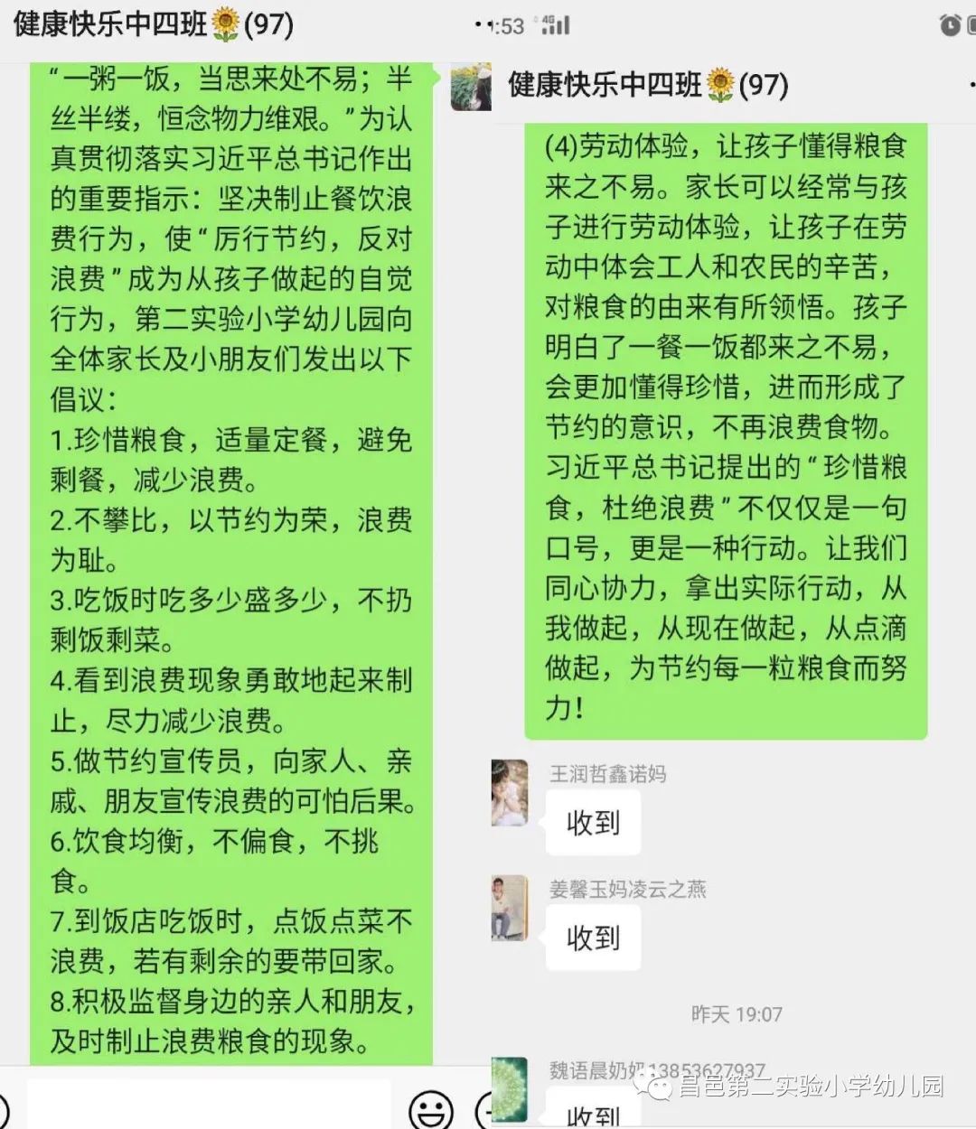 大手拉小手,光盘在行动各班在微信群发布光盘行动倡议书,让家长参与到活动中。