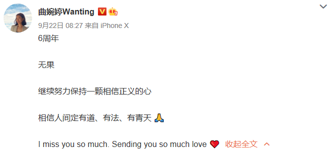 歌手曲婉婷微博发文截图