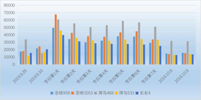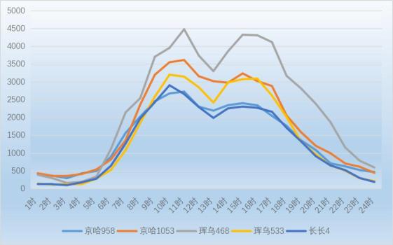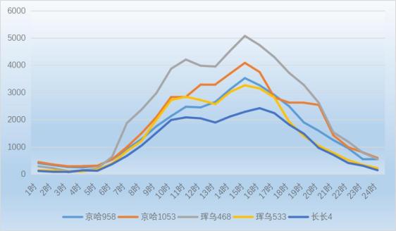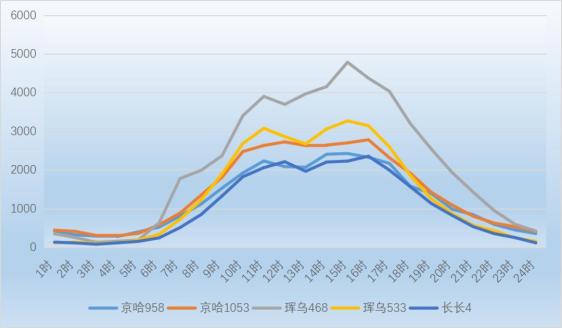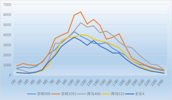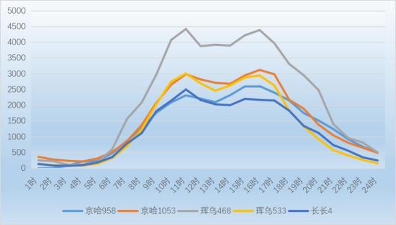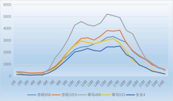 从往年车流总量上看,国庆节期间车流量较平日增加一倍以上。往年分时段车辆变化