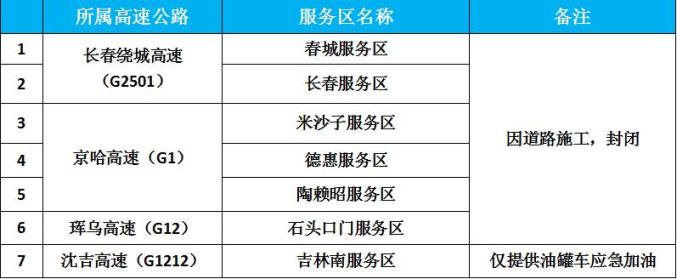 (二)G1京哈高速长春至拉林河段(长春至哈尔滨方向)施工预计9月30日24时结束。陶赖昭、菜园子、米沙子、扶余收费站出、入口关闭。欲经陶赖昭、菜园子收费站驶离高速公路的车辆,请就近选择德惠、扶余南收费站通行;欲经陶赖昭收费站驶入高速公路的车辆,请就近选择德惠或扶余南收费站通行。施工区段内服务区、停车场关闭。(三)因S1长长高速K298+450处道路抢修,9月1日19时至9月25日16时,S1长长高速K298+450双向道路封闭,经S1长长高速去往长白山方向的车辆,请提前在松江河站驶离高速公路,重新从东岗站驶入高速公路;经S1长长高速去往长春方向的车辆,请提前在东岗站驶离高速公路,重新从松江河站驶入高速公路。