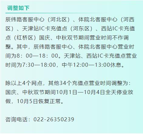 【天津公交IC卡充值网点“十一”调整营业时间】从天津市公交集团融通公司获悉,2020年国庆、中秋双节期间,天津公交IC卡充值网点营业时间有所调整,请广大乘客注意购卡、充值时间。