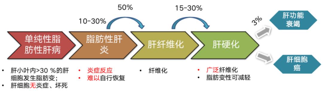 其实,NAFLD若不及早干预延缓进程可造成不可逆肝损伤。简单来说,从脂肪肝到肝癌只要4步:单纯性脂肪性肝病→脂肪性肝炎→肝纤维化→肝硬化→肝癌/肝功能衰竭[2]。