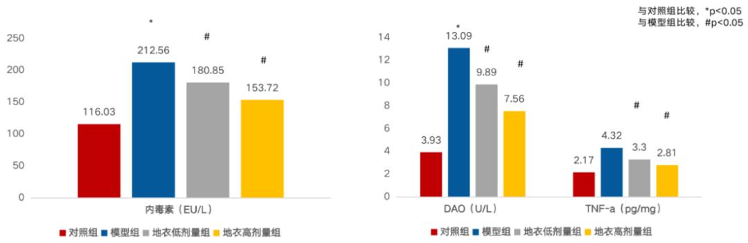 结果显示,相较于对照组和模型组,地衣芽孢杆菌可显著降低NAFLD血内毒素、DAO和TNF-a水平(P<0.05)。