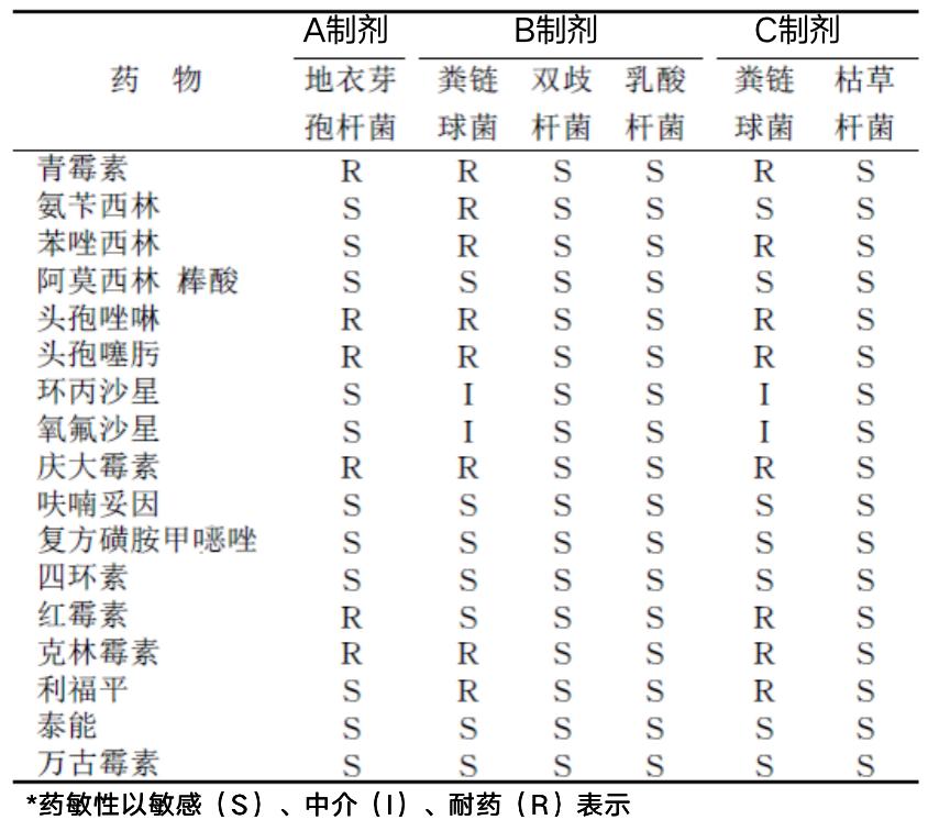 表1:3种微生态制剂所含活菌的药敏试验结果