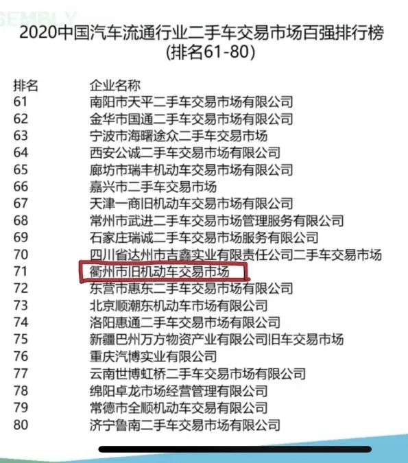 作为一名民建新生代企业家,郑佳将疫情防控作为工作重中之重,坚持一手抓疫情防控、一手抓恢复经营,紧紧依靠全体职工,团结带领全体经营户打赢防疫阻击战和复工复产攻坚战。目前,市场正处于有序经营中,营业份额已完全恢复。在2020年中国汽车流通行业二手车交易市场百强排行榜榜单上,衢州市旧机动车交易市场荣获第71名的成绩。一、转变经营模式,与商户共克时艰