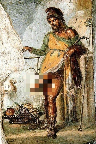 庞贝古城出图的壁画中,希腊的生殖之神普利阿普斯十分显眼,整张壁画最亮眼的,当属胯下大钻头,比小臂还要长一截。