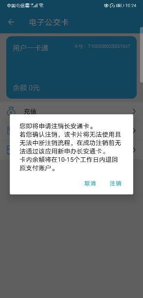 注销若确认不再使用电子公交卡,可在菜单列表内点击注销电子公交卡。确认注销后卡内余额将在10-15个工作日内退回原支付账户。
