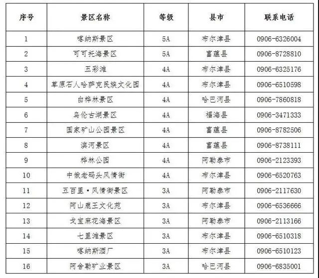 这些景区包括:赛里木湖风景名胜区、阿拉山口口岸边境旅游景区、温泉县博格达(圣泉)景区等3个4A级景区;精河县巴音阿门旅游风景区、精河县滨河旅游风景区、温泉县鄂托克赛尔(天泉)景区、博乐市博尔塔拉河景区、博乐市万亩海棠生态园、温泉县阿敦乔鲁景区、温泉县冷水鱼公园等7个3A级景区;精河敖包·黑山头国防教育基地、温泉县阿日夏特景区2个2A级景区。