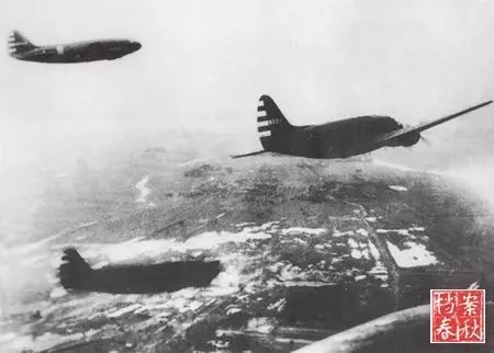 第5分队由3架C-46运输机,组成一个“品”字队形。