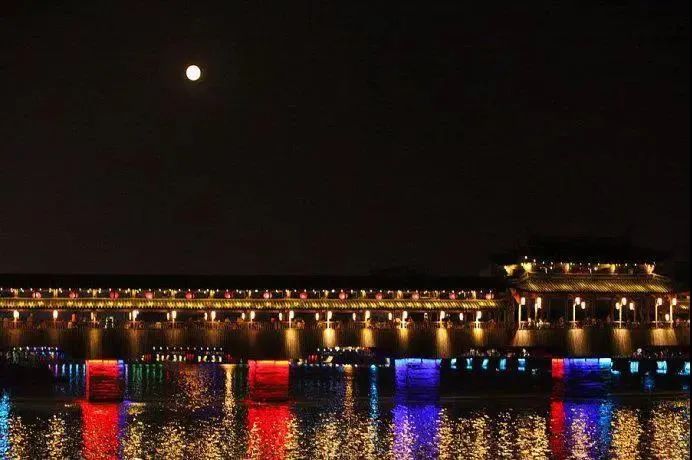 西津桥是坐落在永康城区,南北横跨于永康江上,中为亭阁,两侧重檐。两边施木壁窗棂,供凭栏眺望。桥柱间设桥凳,供行人憩。漫步西津古桥长廊,大红灯笼高悬,廊间梁壁书法遍布。中秋来此揽月,绚丽的色彩一定让你过目难忘。