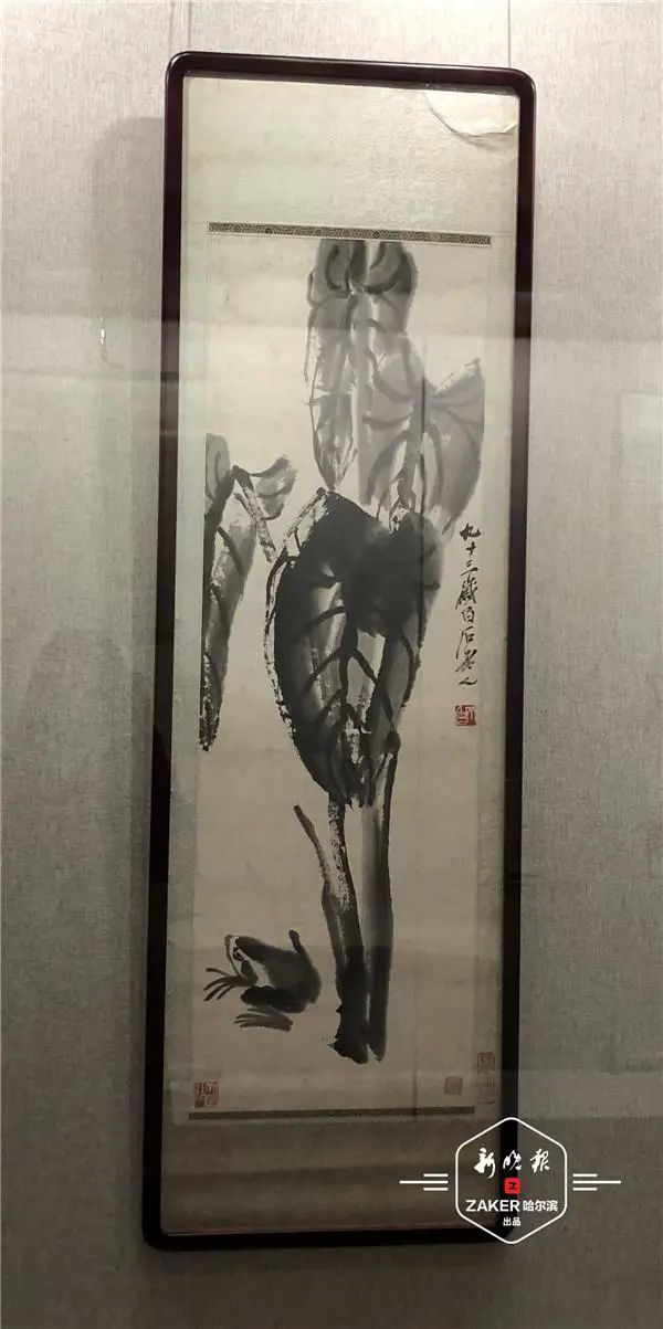 ▲齐白石《茨菇青蛙图轴》胡雷告诉记者,三楼的书画作品均是哈尔滨图书馆的馆藏,这次是首次与世人见面,其中有齐白石 93 岁时的画作《茨菇青蛙图轴》,还有李可染的《秋牧图》、李苦禅的《八哥图》,以及康有为的《行书七绝游杭黄龙洞横轴》等珍品,都是难得一见的佳作。