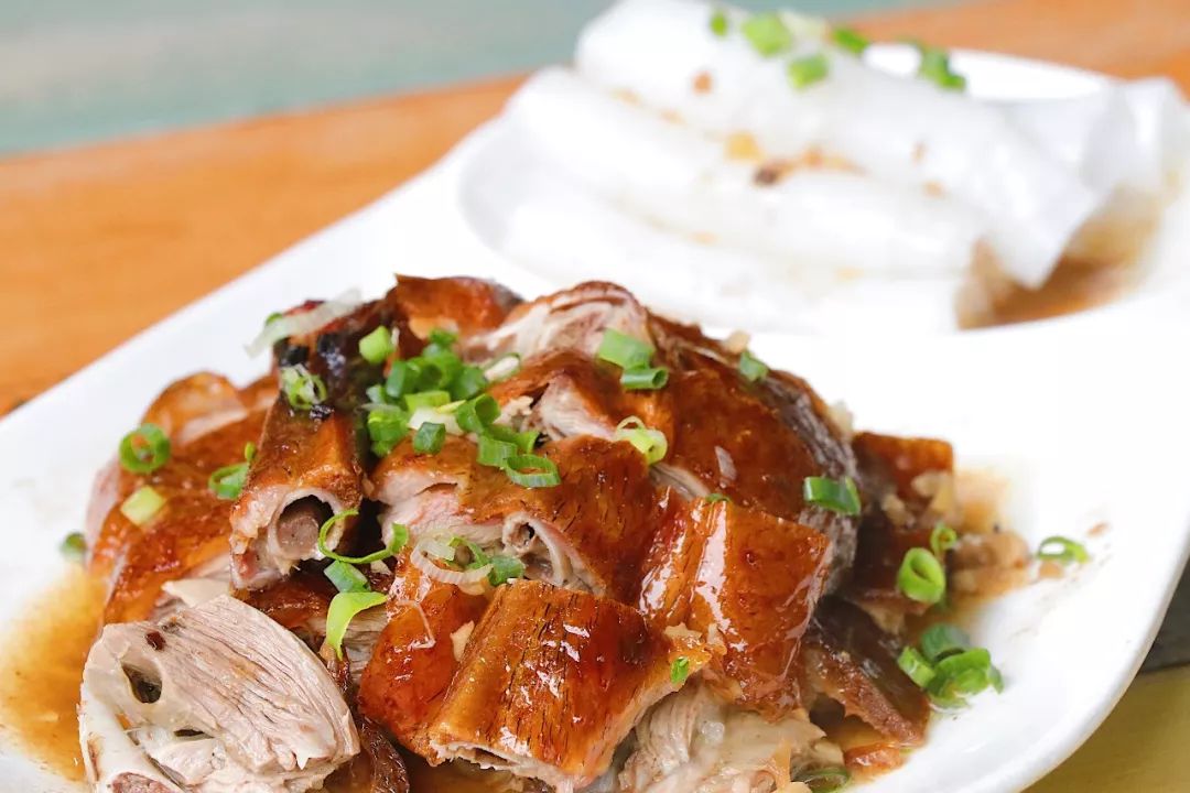 新鲜出炉的靓烧鹅鲜嫩多汁、皮脆肉香,引人垂涎。创意搭配的猪肠粉,有效中和了鹅肉的油腻感,肉更嫩、汁更鲜,瞬间清盘!