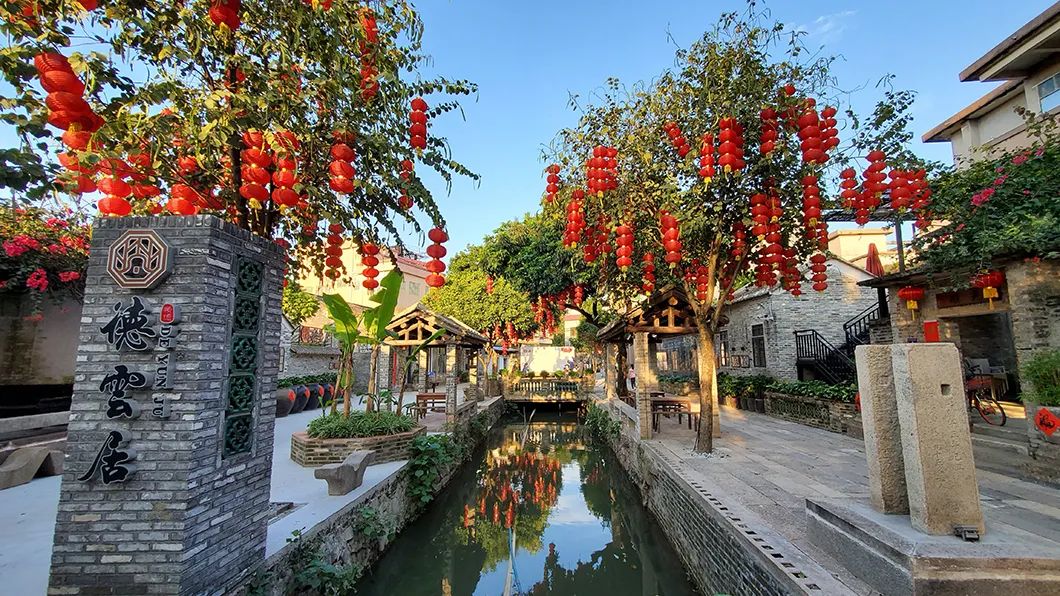 一河两岸的德云居,充分体现了顺德水乡人家的特色。德云居整体由多间历史建筑连片而成,宛如一片缩小版的岭南村落。养眼绿植,潺潺流水,让人自由、自在、自得。