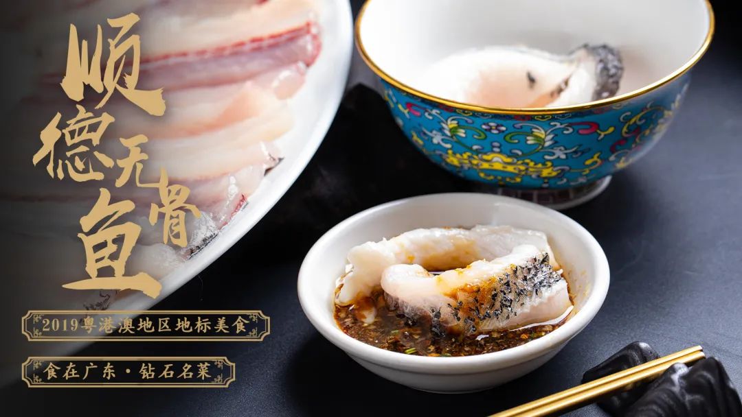 - 顺德无骨鱼 -顺德无骨鱼采用正宗的水库吊水大头鱼,最大的有接近30斤,厨师用精湛的刀法把鱼肉和鱼骨完全分开,鱼柳清水烫熟即可食用,鱼肉爽、滑、鲜、嫩,老幼咸宜。