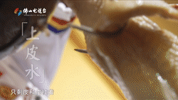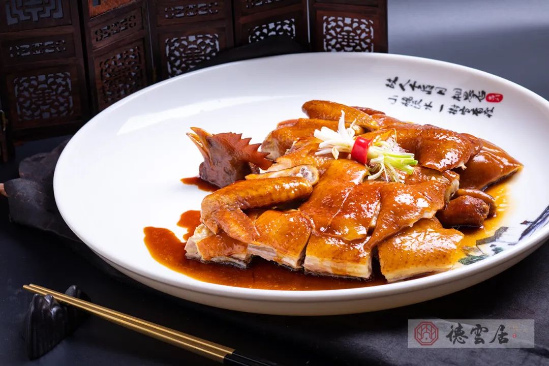 先选上等头抽、特别熬制的鸡汤,将香叶、八角、姜葱、冰糖等配料一起放到锅里面,熬煮半小时做成秘制头抽豉油汁。然后,把处理好的走地鸡,放进头抽豉油汁里面浸泡,让豉油汁慢慢渗透到鸡肉当中,鸡皮呈现金黄亮丽的色泽,而里面的鸡肉依旧保持鲜嫩。- 寻味指引 -