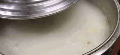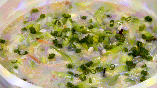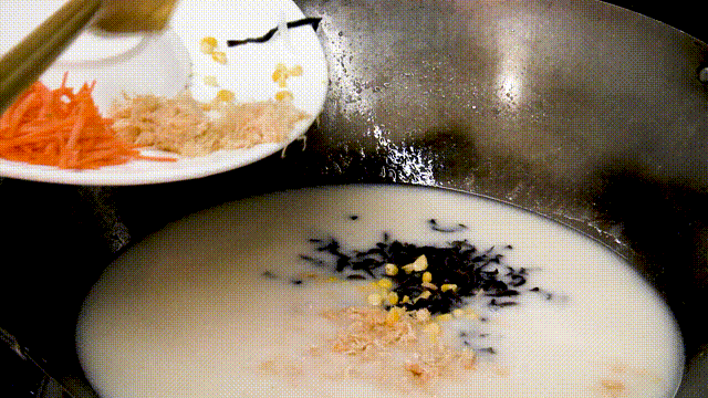随后,以70斤汤、3斤米的比例,加入马坝油粘米、泰国香米、东北大米,煮一个半小时得出粘稠度刚刚好的粥水。