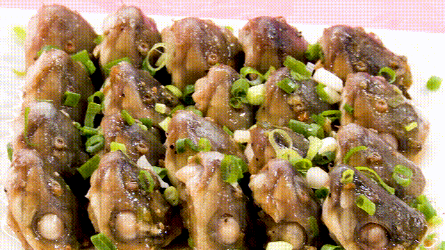 煎焗鱼嘴,也是很考工艺的一道顺德名菜,大头鱼鱼嘴腌味后,落镬煎至两面金黄,随后下葱段和青红椒,盖上锅盖煎熟,即可盛入盘中享用。
