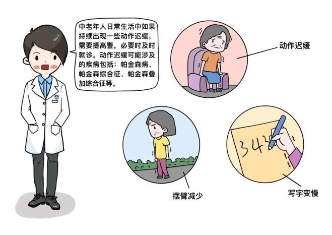 中老年人日常生活中如果持续出现一些动作迟缓,比如行走时自然摆臂动作减少或消失、走路拖步、转身变慢、解纽扣及穿衣裤不灵活、夜间翻身慢、用筷子及写字变慢等,需要提高警惕:这些动作迟缓不一定是因为年纪大了造成的,必要时及时就诊。动作迟缓可能涉及的疾病包括:帕金森病、帕金森综合征、帕金森叠加综合征等。健康辟谣日历