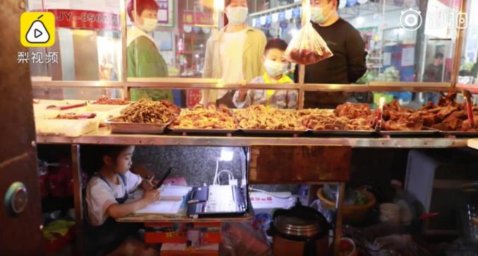 有个小姑娘蜷缩在光线昏暗的铁架之间,点着一盏小灯,用一台老式笔记本电脑上课、写作业。