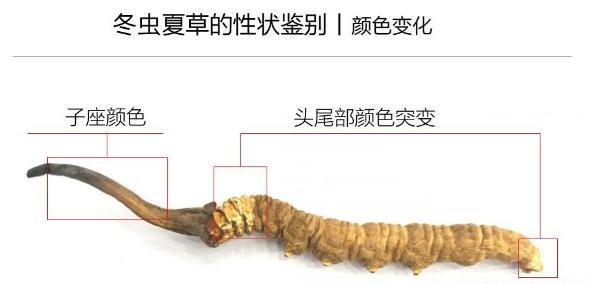 【颜色】正品的冬虫夏草分成“虫”和“草”两部分,“虫”体表面呈深黄到浅黄棕 色,在虫和草的结合部位,头尾部的颜色 会发生一定程度的变化。“草”的部分即子 座,则呈现枯树枝的颜色,色泽较深。