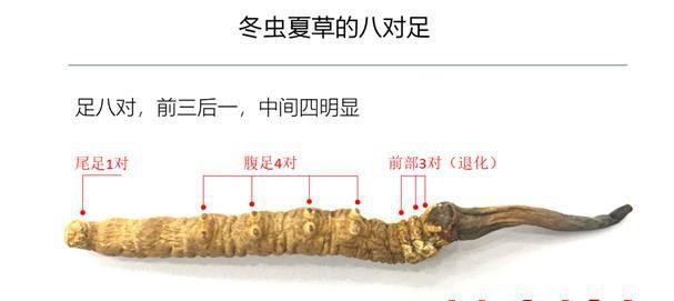 【外形】正品的冬虫夏草腹面有足八对,位于虫体中部的四对非常明显。子座自虫体头部生出,上部稍膨大。长可达 4-7 厘米,径约0.3厘米。