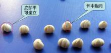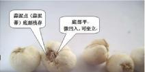 外形呈类圆锥形或近球形, 形如“怀中抱月”,顶端闭合,稍尖或钝圆, 底部平,微凹入,偶有残存须根,称“蒜泥点”。质地坚硬且脆,断面白色。