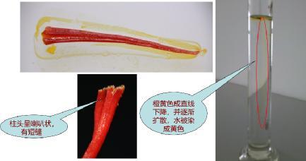 【水试】西红花放入水中,可见橙黄色成直线下降,并逐渐扩散,真品一端膨大成喇叭状,一侧有裂缝,否则是其伪品。